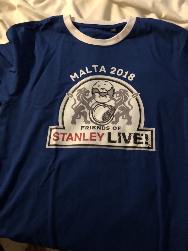 Na een even gespiekt te hebben bij de kroeg waar we vanavond spelen, hebben we lekker geproost op de trip met een caloriearm biertje. Ook kreeg Stanley zijn Vrienden van Stanley Live shirt uitgereikt.