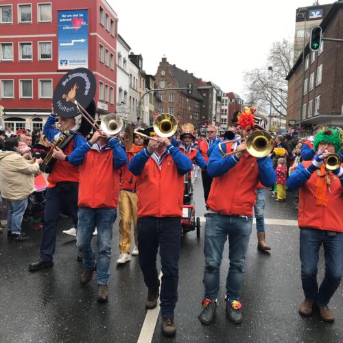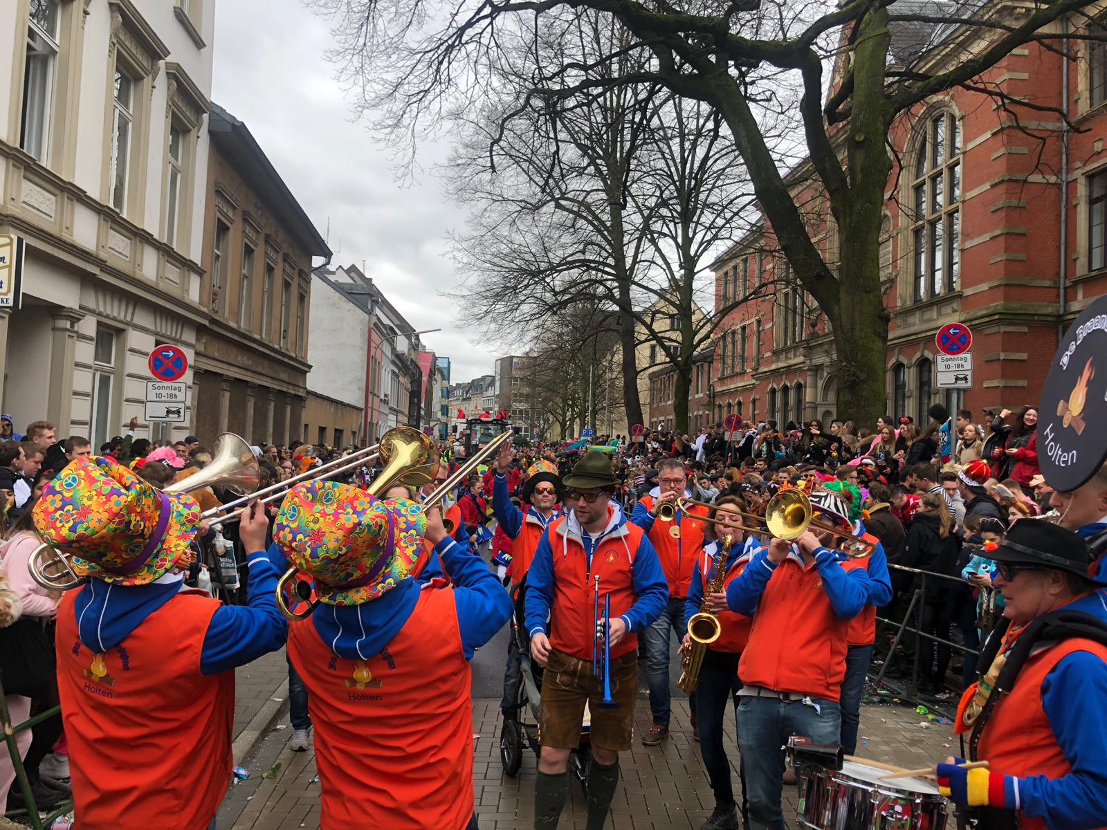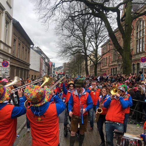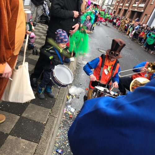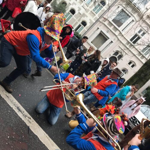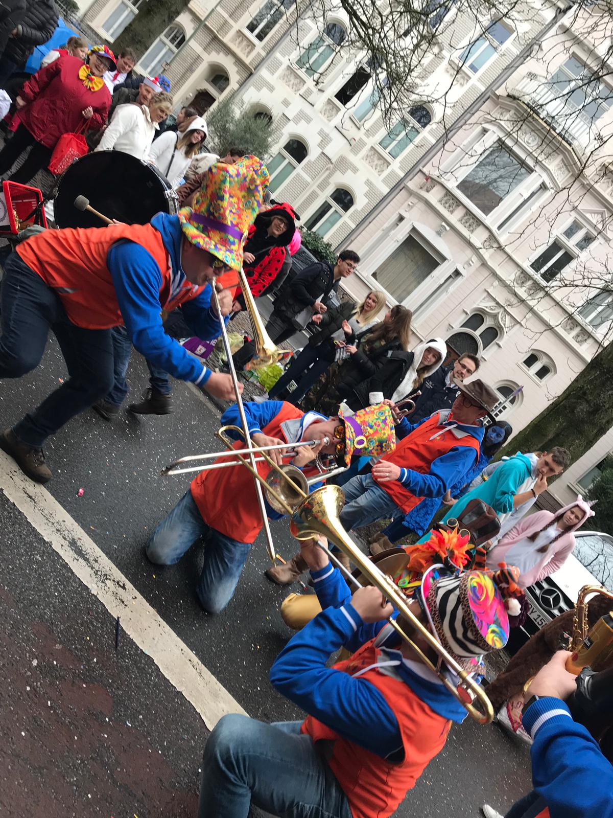 Voor het eerst zijn we uitgenodigd in Neuss (D) en mochten we spelen tijdens de optocht, Kappessonntagszug genoemd. De gehele heenweg regende het, maar eenmaal aangekomen in Neuss, klaarde het op en werd het mooi Umzugswetter. Vooraf speelden we even warm.