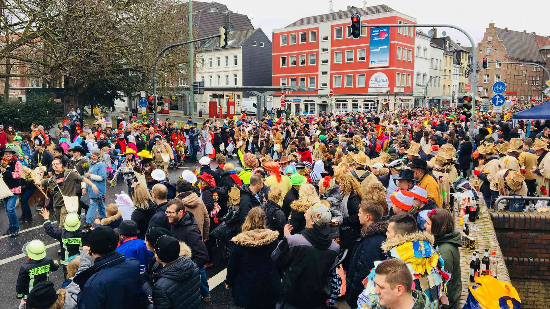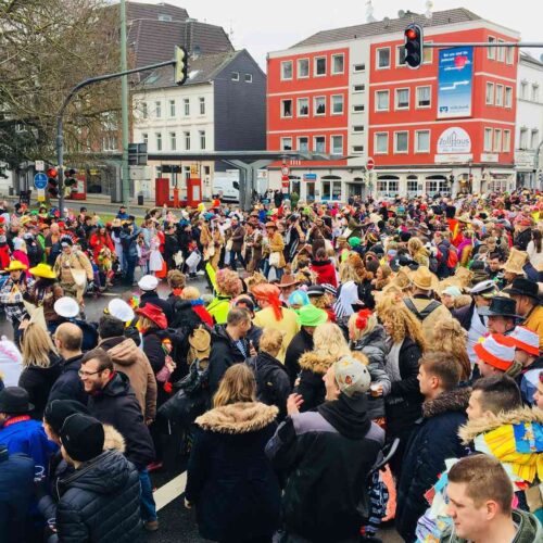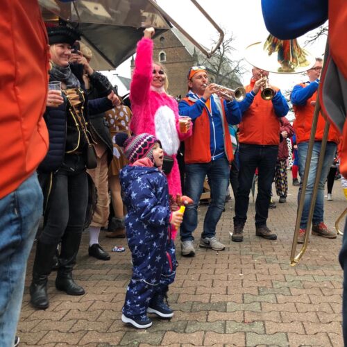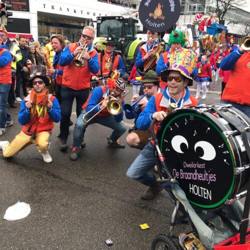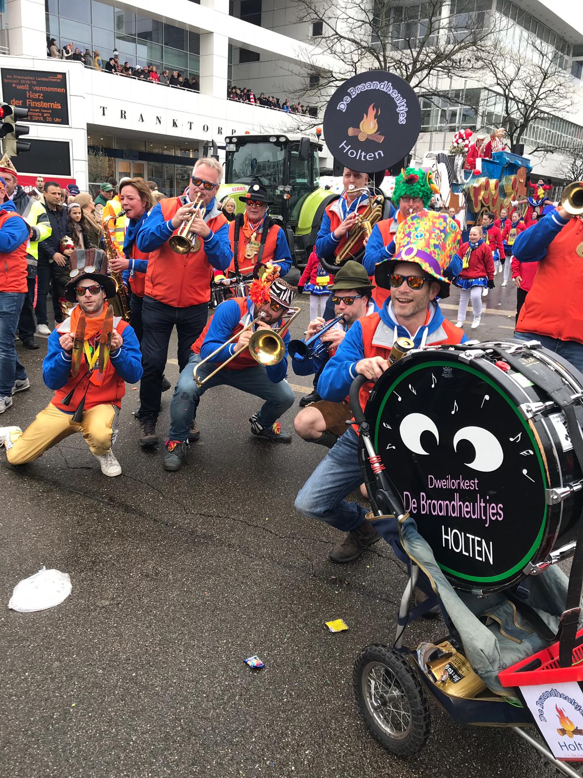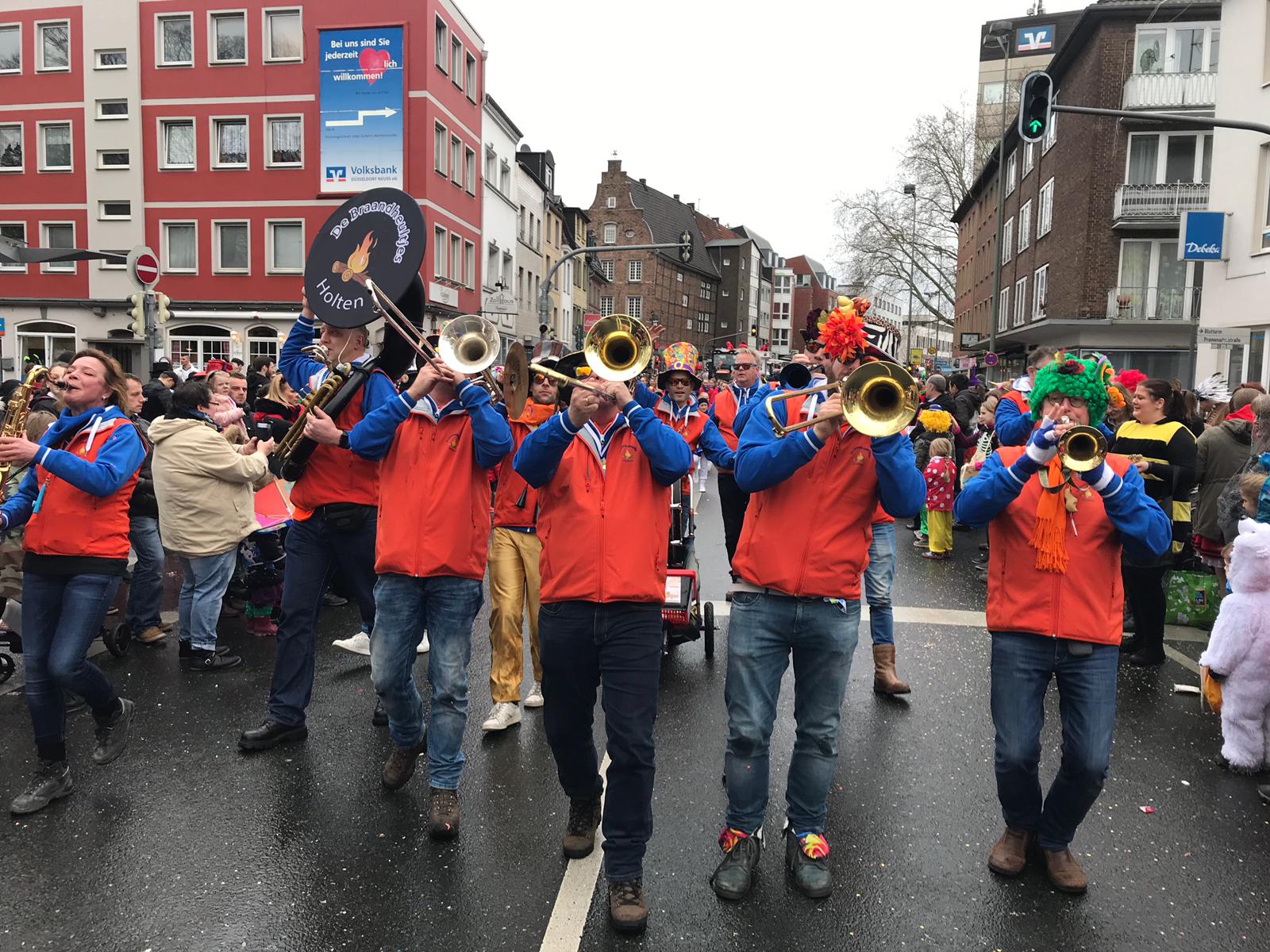 Voor het eerst zijn we uitgenodigd in Neuss (D) en mochten we spelen tijdens de optocht, Kappessonntagszug genoemd. De gehele heenweg regende het, maar eenmaal aangekomen in Neuss, klaarde het op en werd het mooi Umzugswetter. Vooraf speelden we even warm.