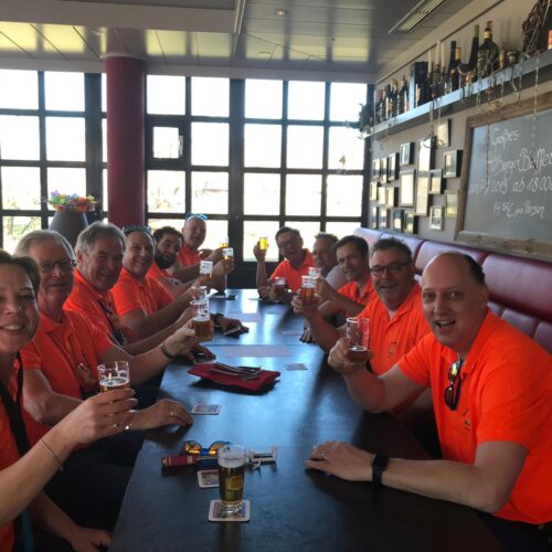Het publiek stond rijen dik langs de kant om de massaal uitgedeelde Kamelle (snoep) te verzamelen. Van ons kregen ze muzikale lekkernijen. En die vielen erg in de smaak. We kregen een grote groep mee dansend Van links naar rechts op de tribunes. Na een zeer geslaagde optocht streken we neer in een kroegje om even bij te komen van de inspanning. Op de terugweg nog een echte Duitse Bratwurst naar binnen geschoven en toen in de bus, terug naar die Heitmat.