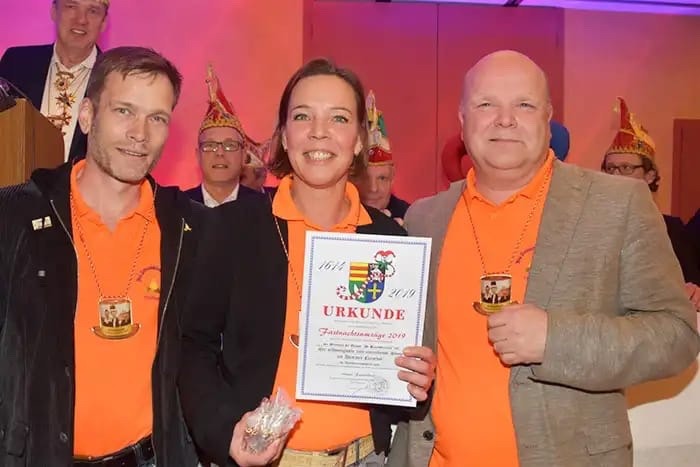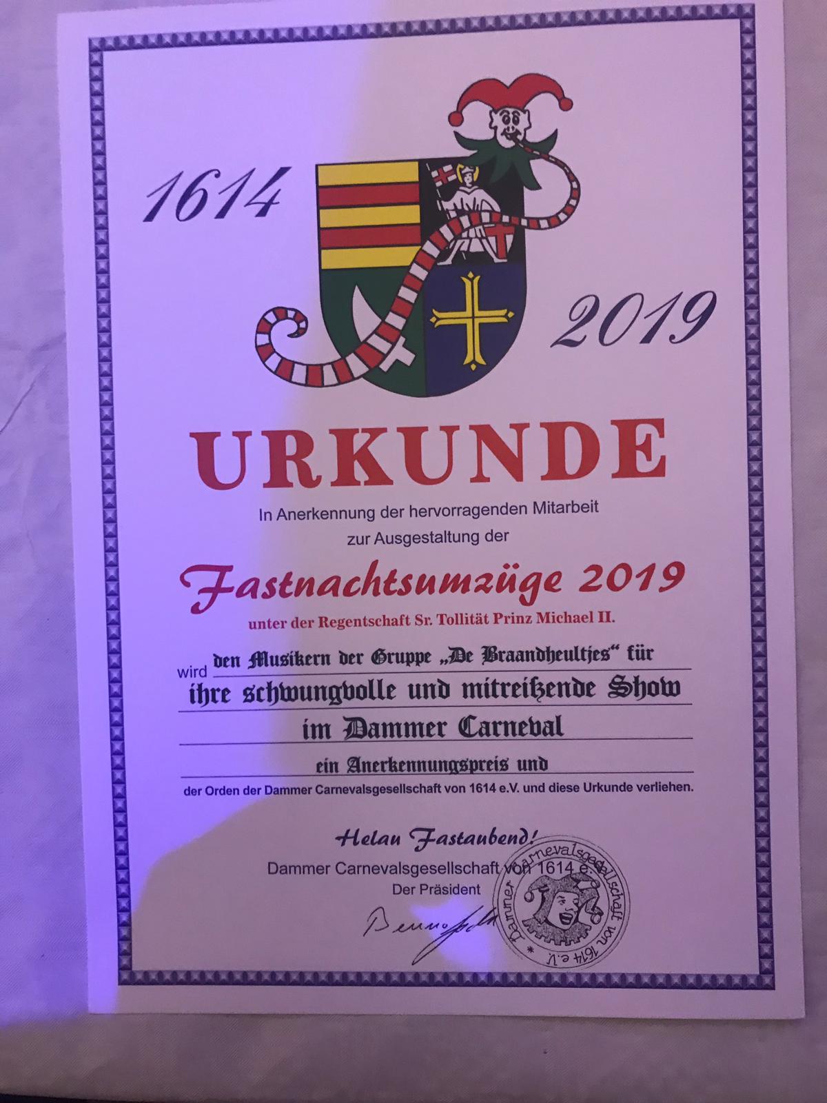 Op 9 maart ontvingen wij uit handen van de Dammner Karnevalsverein een oorkonde voor onze jarenlange inzet en medewerking aan de optocht. Met een select gezelschap reisden we af naar Damme voor deze speciale avond. De jury roemde ons om “onze swingende en opwindende show“. Wij waren uiteraard zéér vereerd! Bovendien mochten de mensen met bijbehorende medaille de rest van de avond gratis drinken.