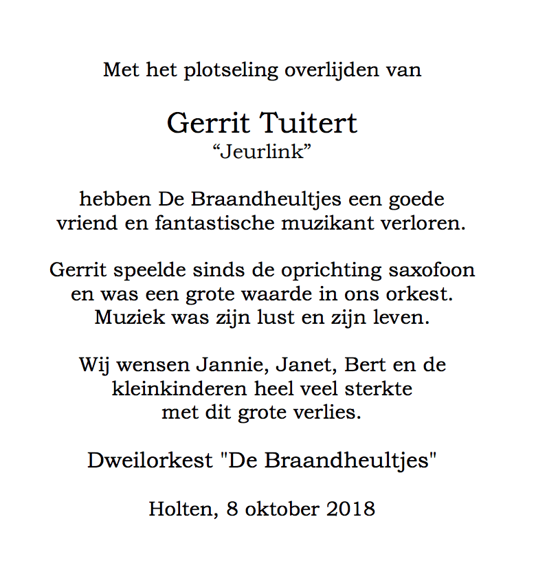 ← Plotseling overlijden van Gerrit Tuitert - 80 jaar
